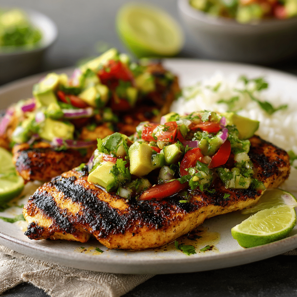 Juicy lime-cilantro grilled chicken breasts topped with fresh avocado, tomato, red onion, and jalapeño salsa for a bright, wholesome dinner.