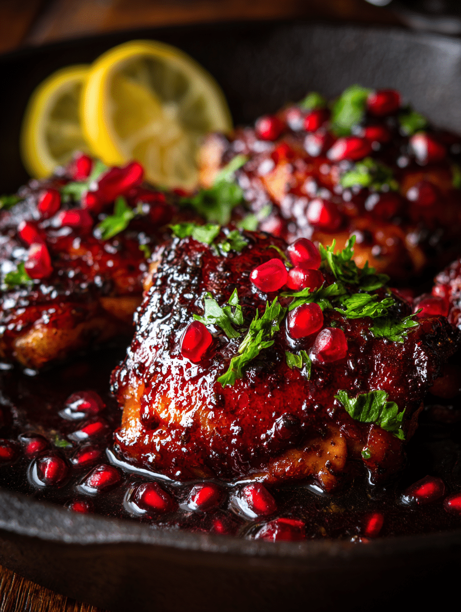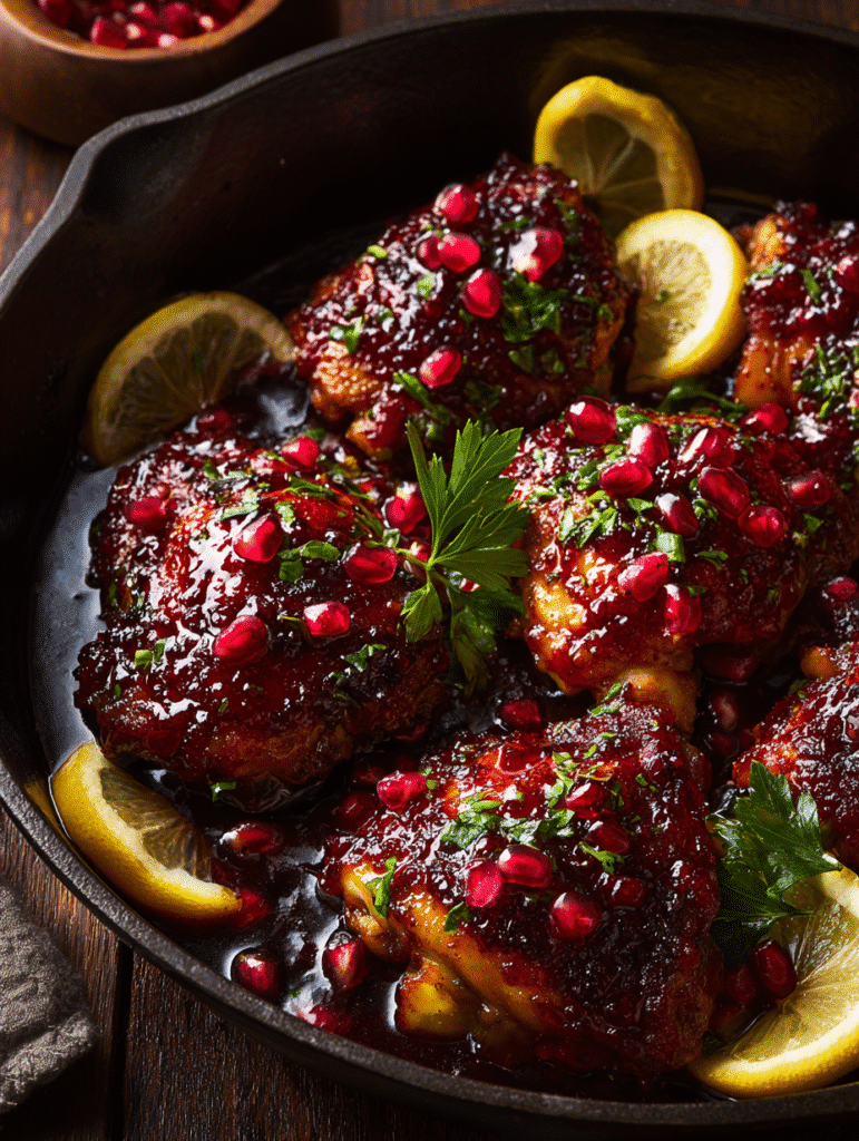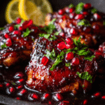 Juicy chicken thighs baked in a tangy-sweet pomegranate molasses glaze and topped with fresh pomegranate seeds and parsley.