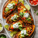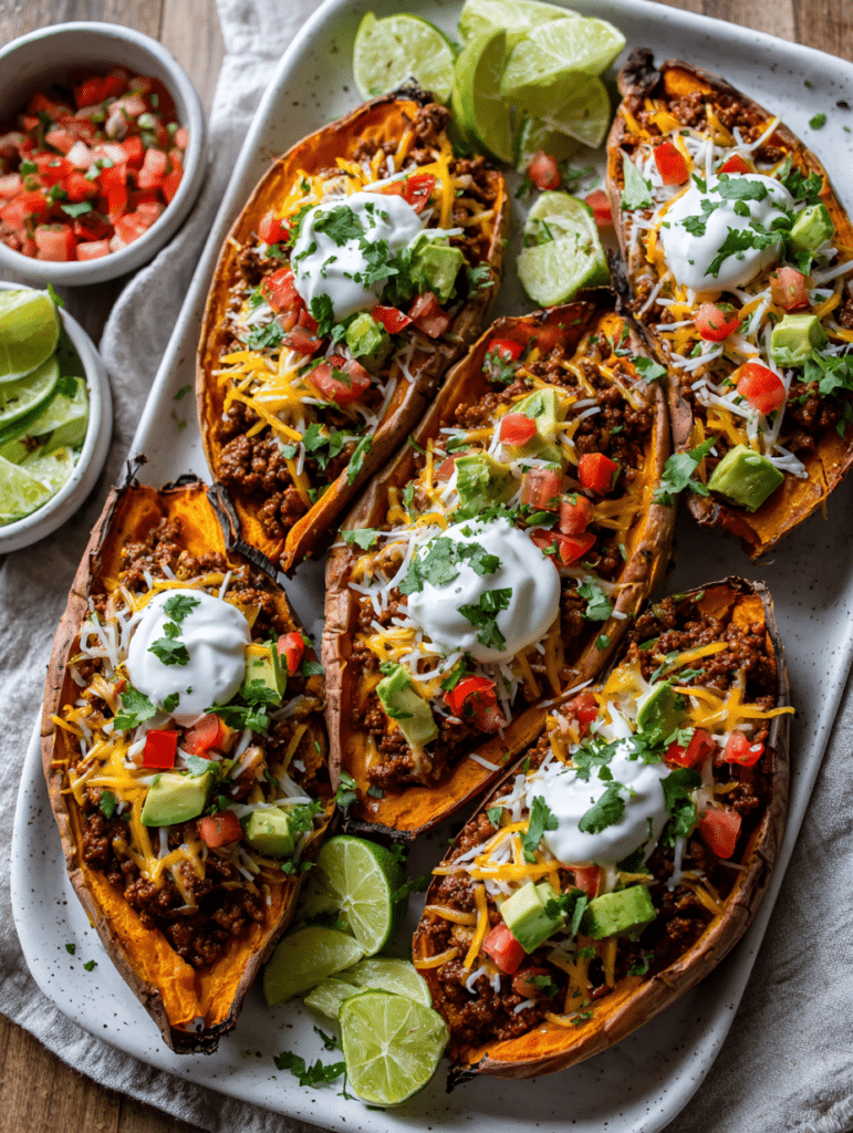 Place each opened sweet potato on a plate. Generously spoon the seasoned taco meat over each potato, allowing it to nestle into the fluffy interior. Now comes the fun part adding your favorite toppings! Sprinkle shredded cheese while the sweet potato is still hot so it melts perfectly. Add fresh diced tomatoes, creamy avocado or guacamole, and a dollop of sour cream.