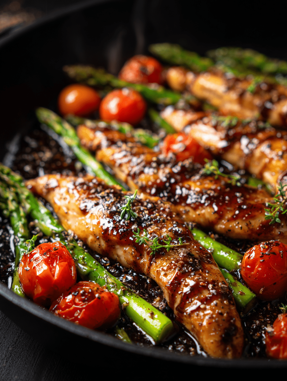 Juicy chicken tenders, asparagus, and cherry tomatoes tossed in a sweet-tangy balsamic glaze for a 30-minute skillet dinner.