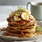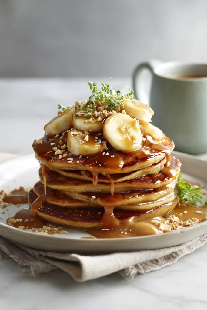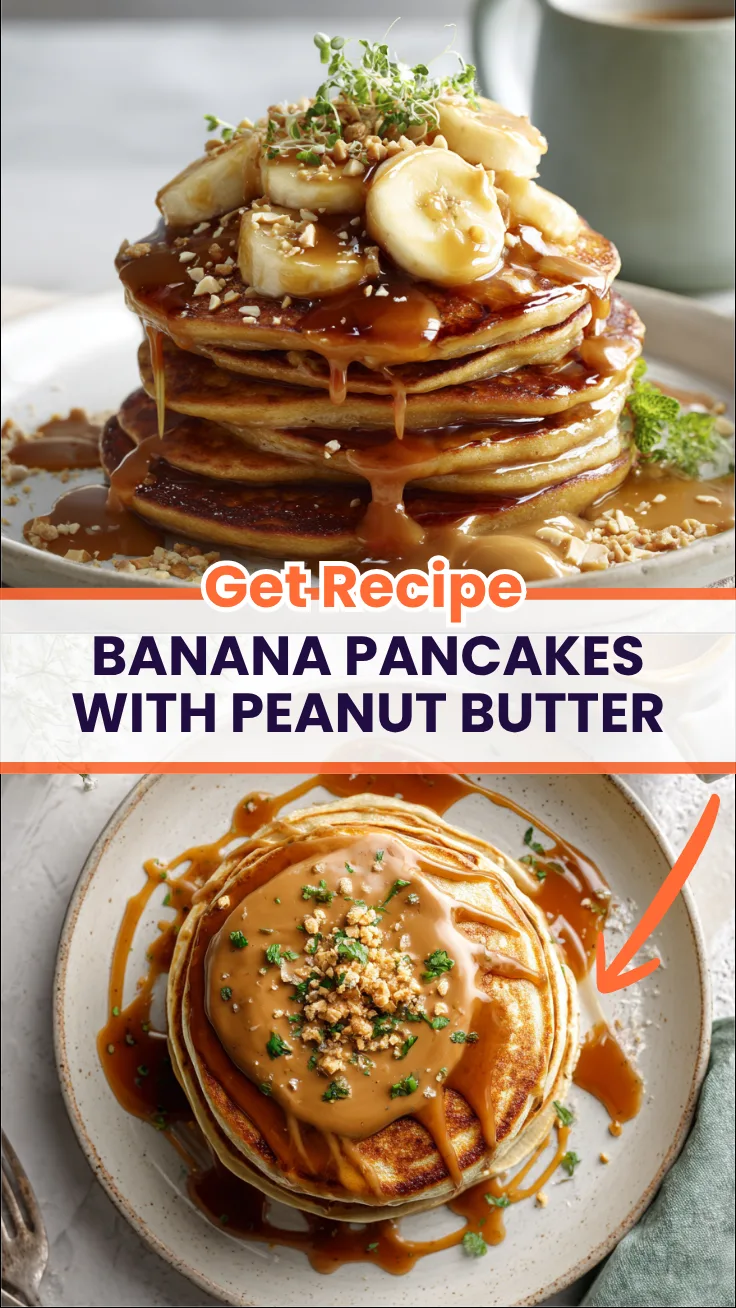 Fluffy banana pancakes topped with a warm, creamy peanut butter sauce. A quick and flavorful breakfast combining ripe bananas, buttermilk-style batter, and a homemade nutty glaze for a sweet and satisfying meal.