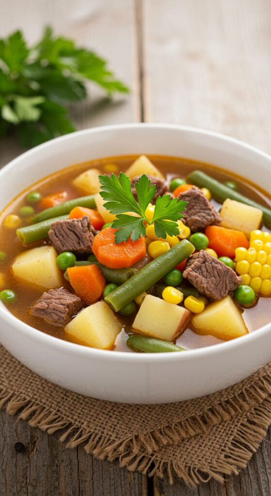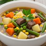 - Add Remaining Vegetables: Stir in the green beans (if not added earlier), corn, and peas. Simmer for another 15 minutes until all vegetables and beef are tender.