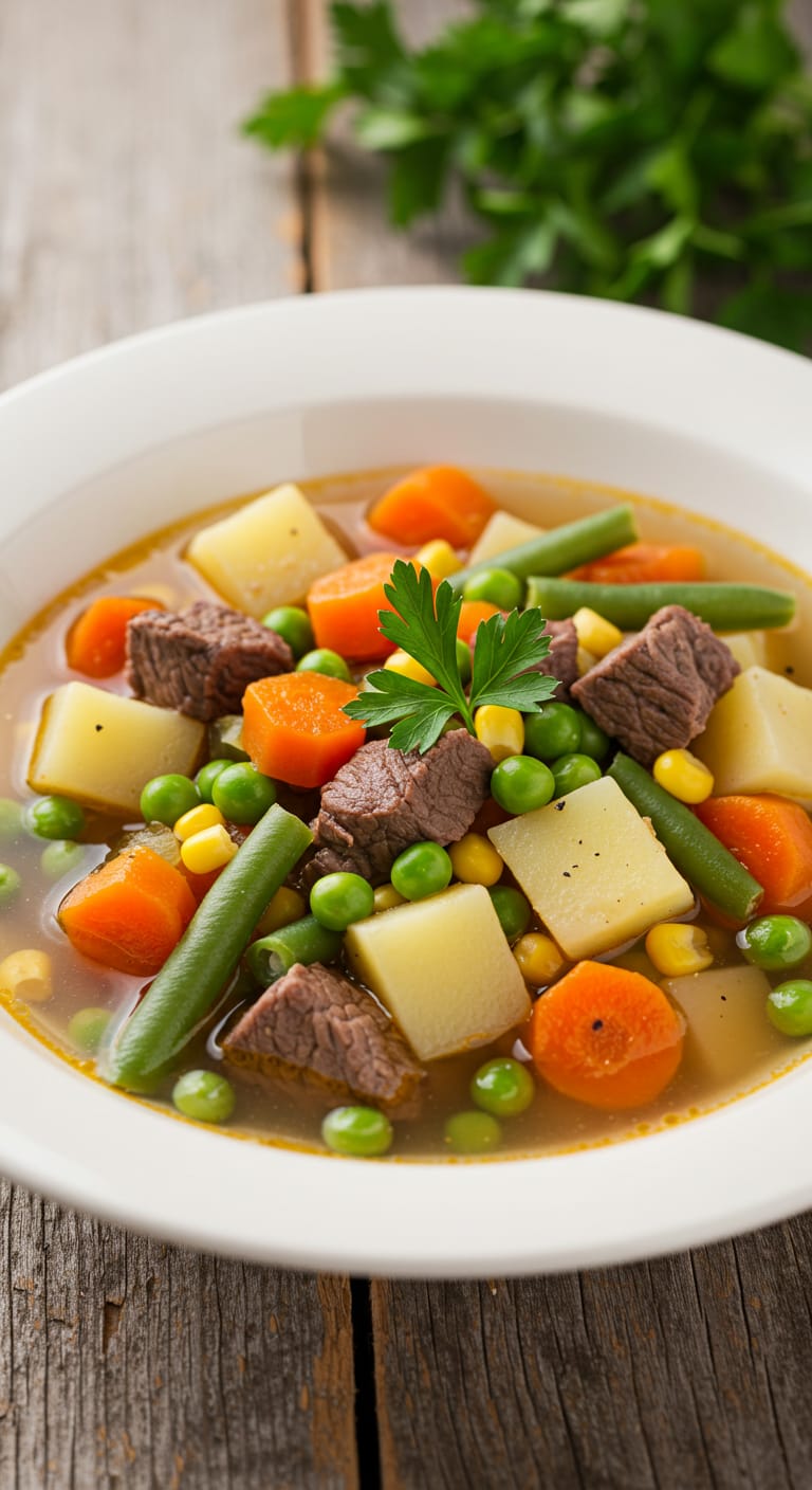 - Add Remaining Vegetables: Stir in the green beans (if not added earlier), corn, and peas. Simmer for another 15 minutes until all vegetables and beef are tender.