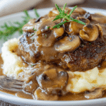 This isn’t just another ground beef recipe – it’s a game-changer for busy weeknights. You’ll love how the beef patties stay incredibly moist and flavorful thanks to the grated onion and breadcrumb mixture. The homemade mushroom gravy is so much better than anything from a can, and it comes together while the steaks simmer to perfection.
