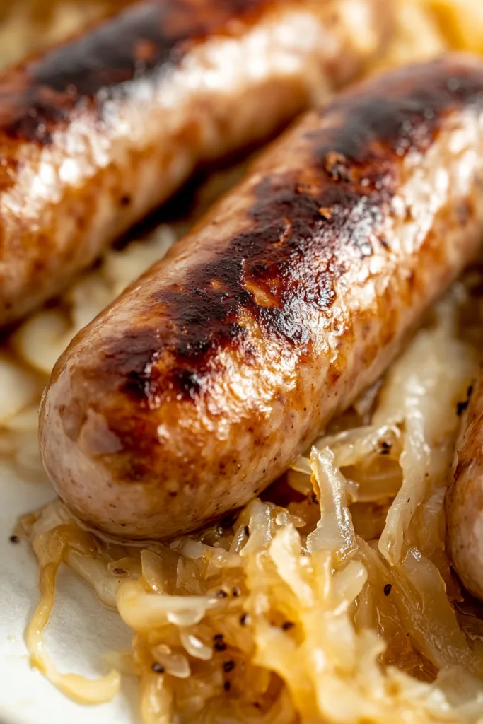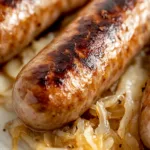 These brats with sauerkraut pair beautifully with a range of sides. For a classic German-American spread, serve them alongside creamy mashed potatoes or warm soft pretzels. They also make excellent spring party food when served buffet-style with mustard, horseradish, and rye bread. For a lighter spring lunch idea, pair with a simple green salad dressed in apple cider vinaigrette.