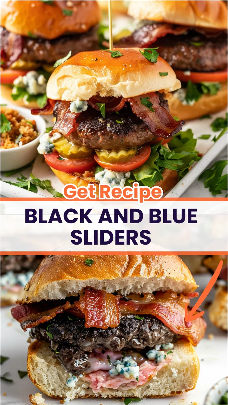Black and Blue Sliders are mini burgers made with ground beef seasoned with a bold blackening spice blend and stuffed with blue cheese crumbles. The “black” refers to the charred, spiced crust on the patty, while the “blue” refers to the tangy blue cheese inside and on top.