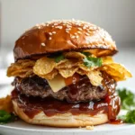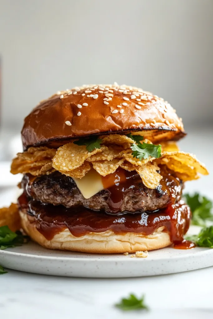 One of the best things about this Bourbon BBQ Crunch Burger is how easily it adapts to personal tastes. Swap white cheddar for pepper jack if you want a spicy kick. Add crispy bacon between the cheese and the sauce for extra richness. Try a brioche bun instead of a standard hamburger bun for a slightly sweeter, more indulgent bite. No matter how you build it, the combination of smoky bourbon sauce, juicy beef, and crunchy chips makes this burger a guaranteed crowd-pleaser at any Memorial Day dinner ideas lineup or summer cookout.