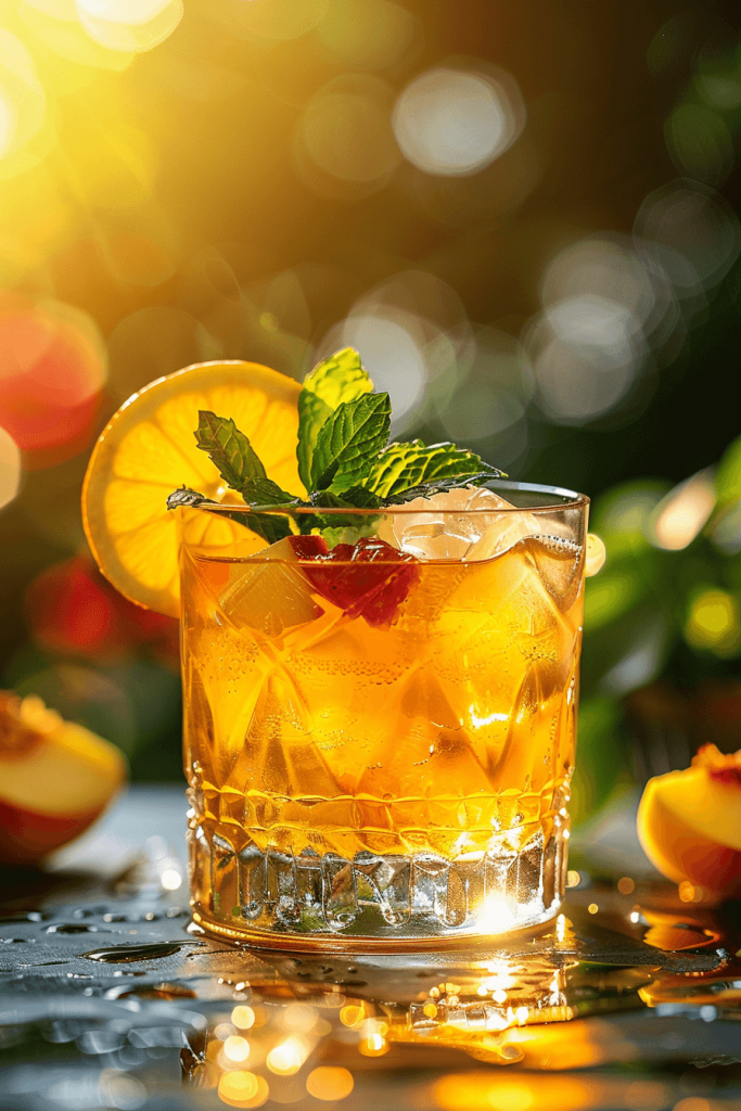 Bright citrus, peach sweetness, and herbal complexity meet smooth bourbon in this stunning summer cocktail. Perfect balance of sweet, tart, and botanical.