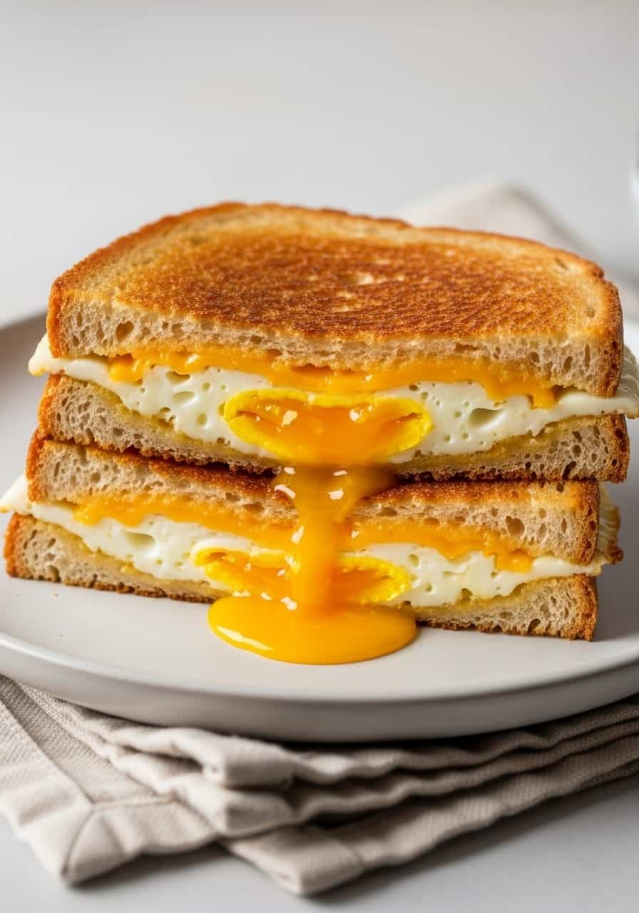 A hearty, melty breakfast sandwich featuring eggs tucked inside grilled cheese. Quick, satisfying, and endlessly customizable.