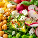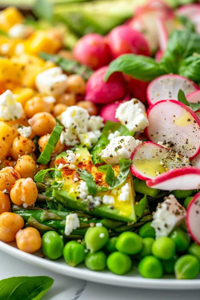 Arrange a generous layer of salad greens on a large serving platter. Layer the dressed asparagus and pea mixture on top of the greens. Then scatter the thinly sliced radishes, crumbled feta cheese, diced avocado, chopped toasted pistachios, and roasted chickpeas evenly over the top. Drizzle the remaining herb lemon dressing over the entire salad. Finish with a scatter of fresh basil, mint, and/or chives, and season one final time with salt and pepper. Serve immediately.