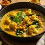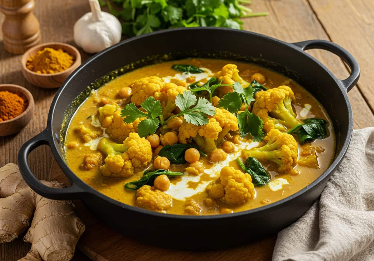“Cauldron Curry” is a plant-based, coconut-milk curry featuring chickpeas, cauliflower, and leafy greens made in a single pot for flavor and convenience.