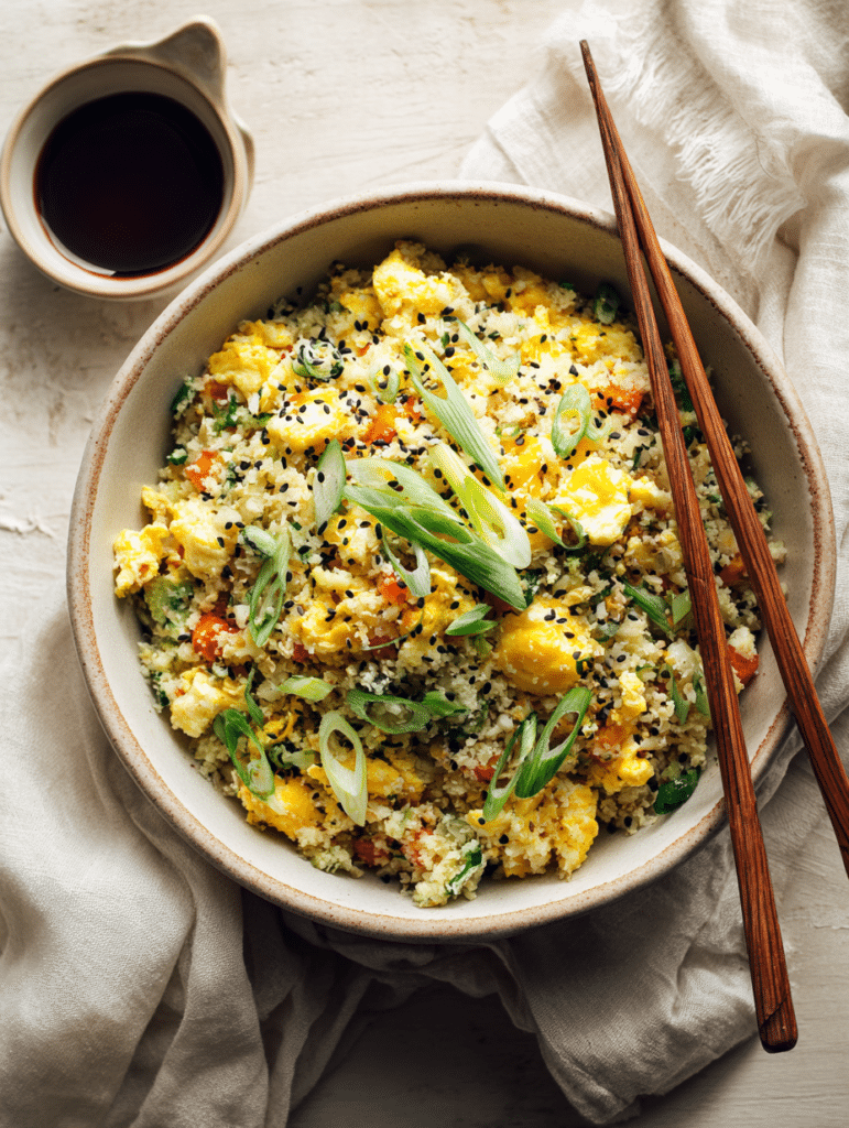 Swapping rice for cauliflower cuts carbs while eggs add protein ideal for dinner ideas recipes.