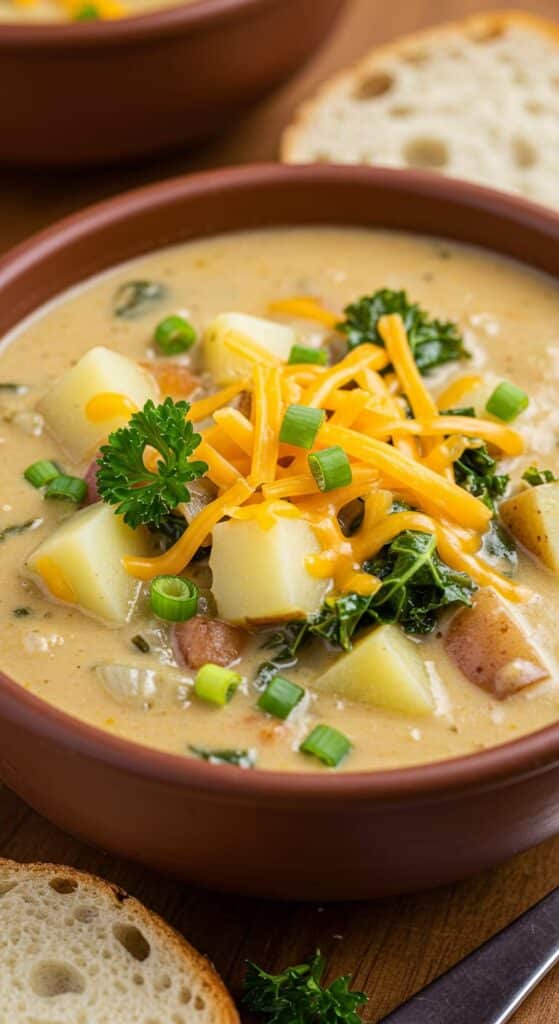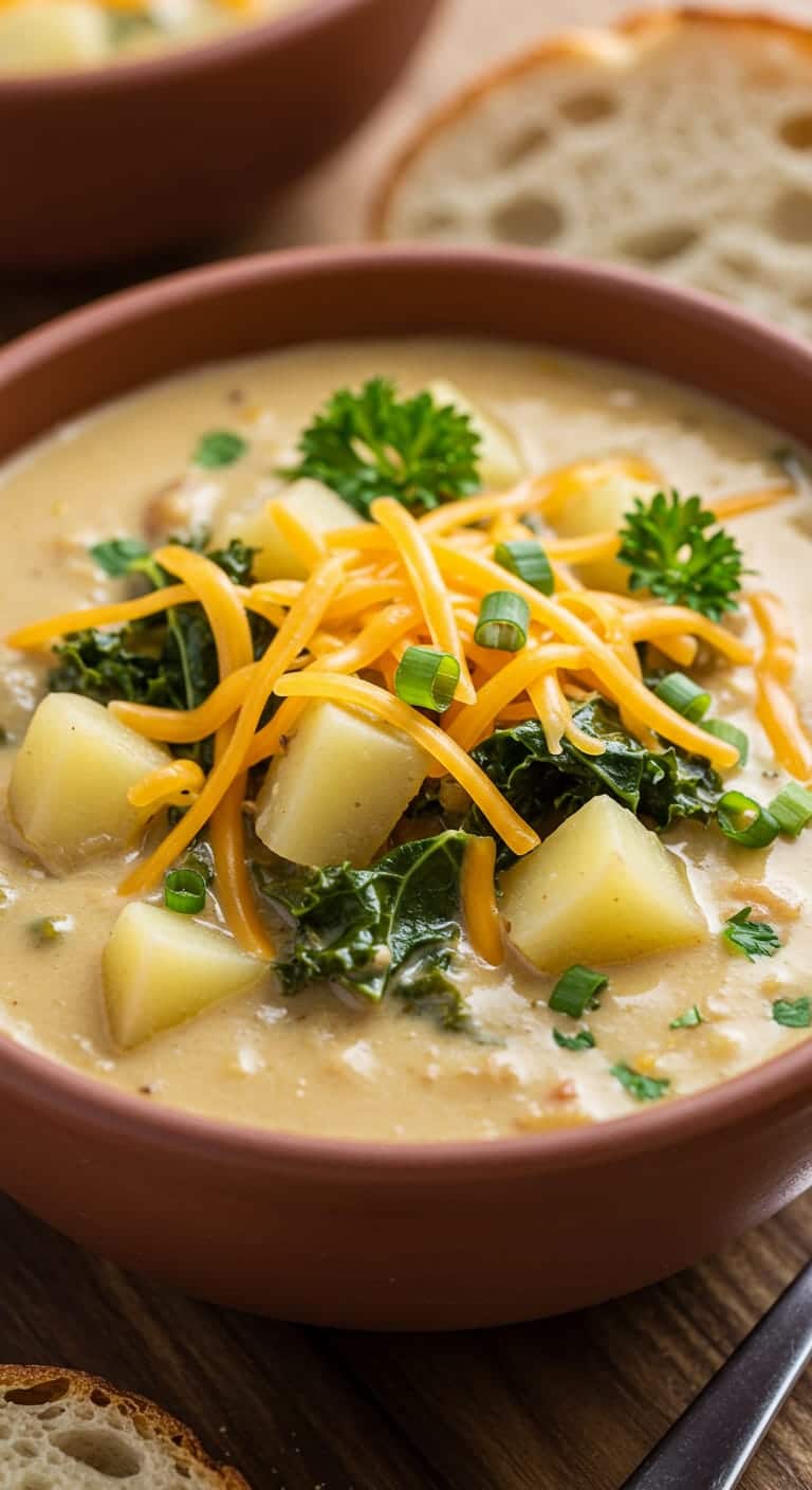 A rich and creamy Hearty Cheddar Garlic Herb Potato Soup with tender potatoes, sharp cheddar, and fragrant herbs, perfect for cozy meals.