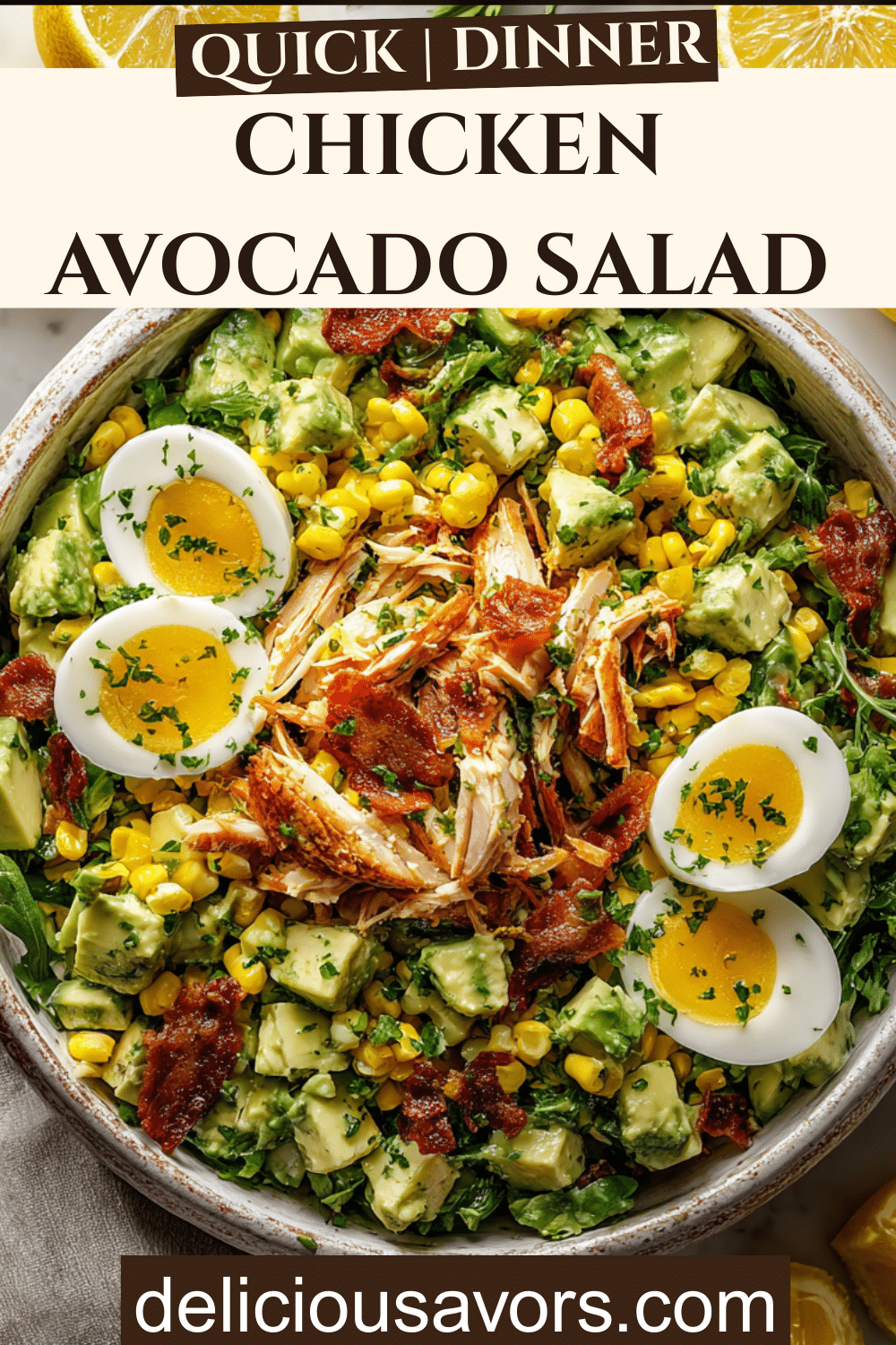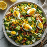 This Chicken Avocado Salad combines tender chicken, creamy avocados, crispy bacon, and sweet corn with a zesty lemon dressing. Ready in just 15 minutes, it’s a perfect healthy dinner that’s both satisfying and delicious.