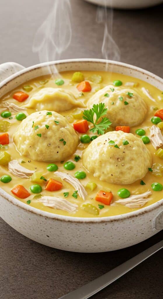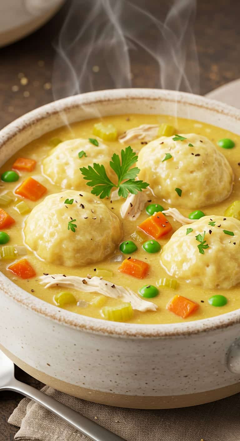 - Ultimate comfort food with a creamy, savory broth and soft dumplings.