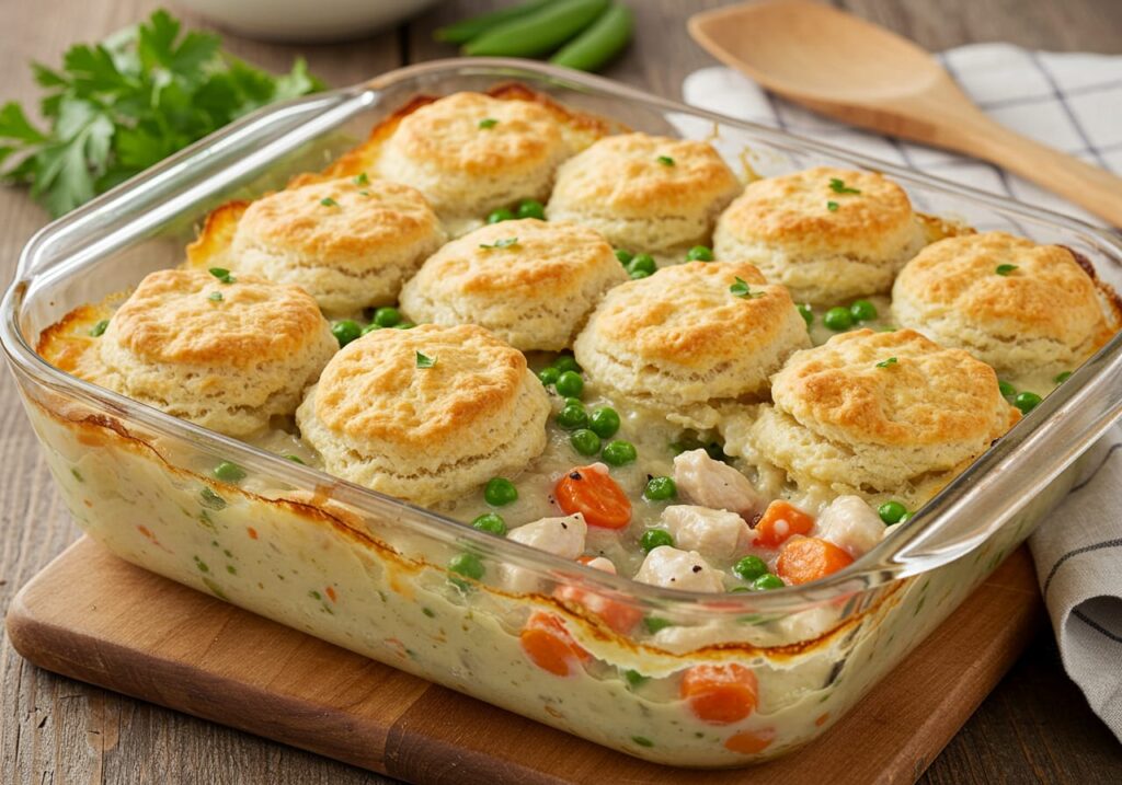 Chicken Pot Pie Casserole is a comforting and hearty dish featuring tender chicken, vegetables in a creamy sauce, topped with flaky biscuits. Perfect for family meals or cozy dinners.