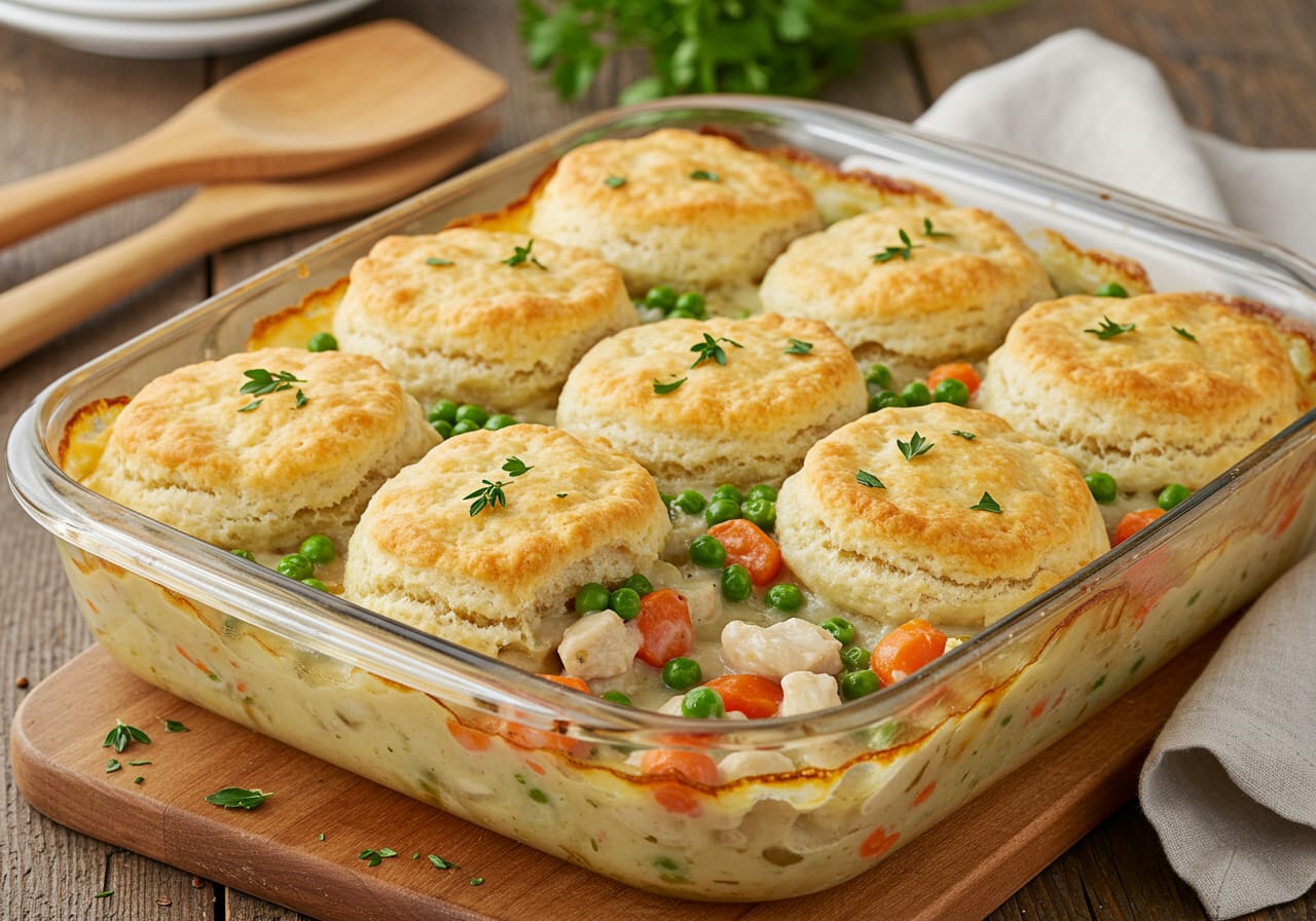 Chicken Pot Pie Casserole is a comforting and hearty dish featuring tender chicken, vegetables in a creamy sauce, topped with flaky biscuits. Perfect for family meals or cozy dinners.