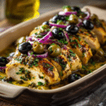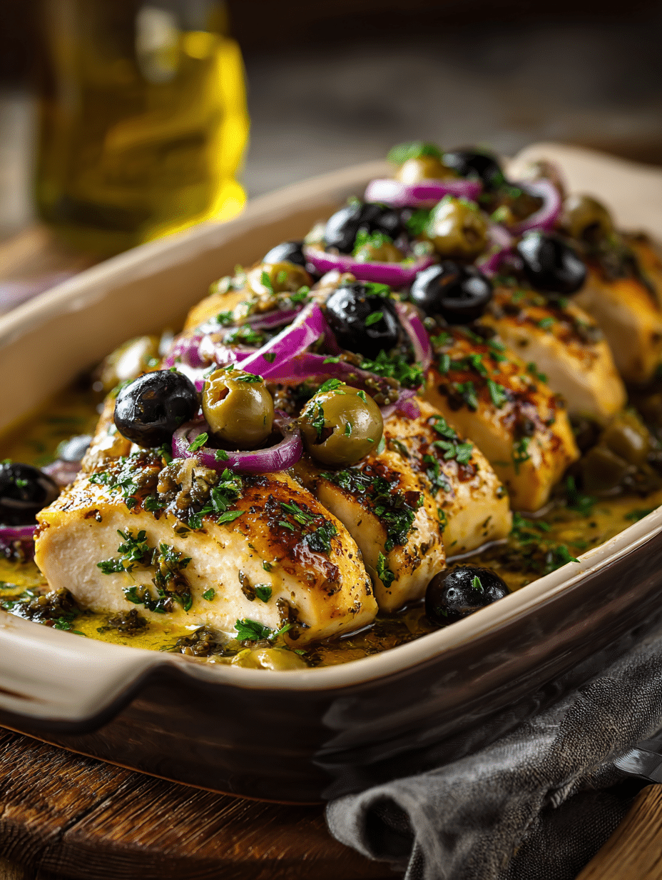 Mediterranean chicken breasts baked with briny capers, olives, Dijon, and lemon in a zesty sauce. Easy, healthy, and bursting with flavor.