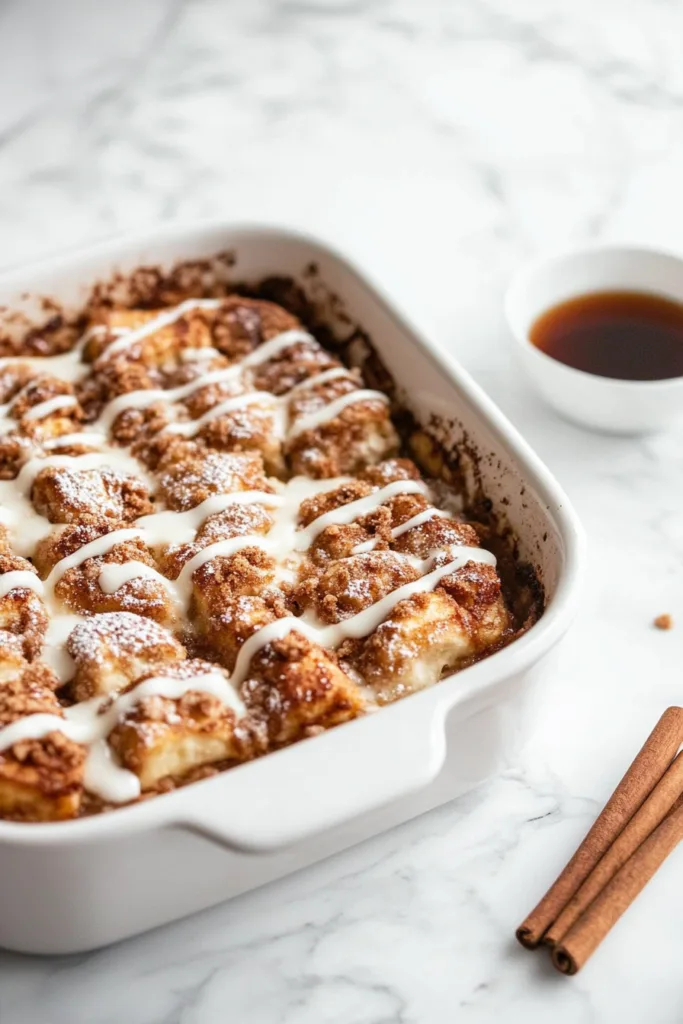 Toss 1 cup of peeled, diced apple with a pinch of cinnamon and fold it in between the cinnamon roll pieces before adding the custard. This adds a fruity warmth that pairs beautifully with the streusel topping.