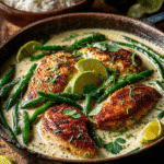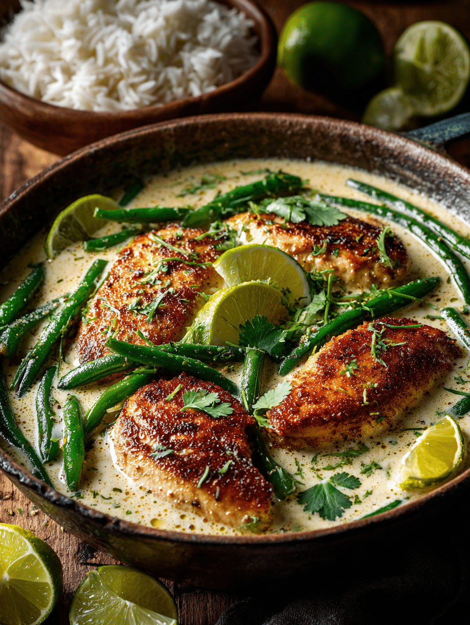 Tender chicken breasts seared and simmered in a creamy coconut sauce with lime, ginger, and fresh green beans. Ready in 30 minutes for an easy weeknight dinner.