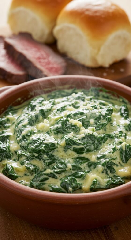 A creamy, comforting creamed spinach recipe made with fresh spinach, cream cheese, and Parmesan. Perfect as a side dish for steak, chicken, or holiday dinners.