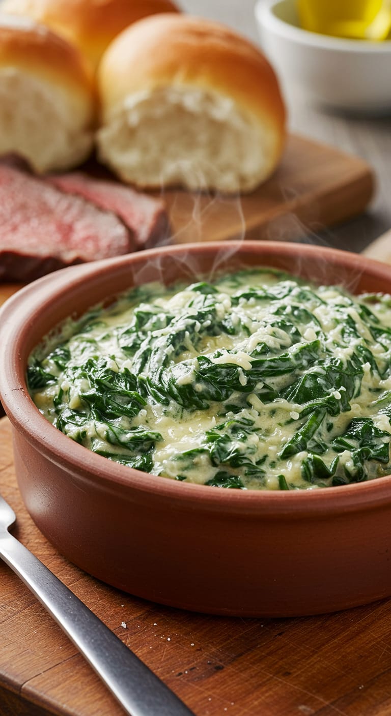 A creamy, comforting creamed spinach recipe made with fresh spinach, cream cheese, and Parmesan. Perfect as a side dish for steak, chicken, or holiday dinners.