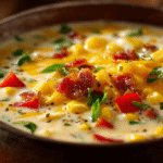 This Corn & Cheese Chowder proves that comfort food doesn’t have to be complicated or time-consuming. With simple ingredients, straightforward techniques, and minimal cleanup, you can create a restaurant-quality soup that brings warmth and satisfaction to your dinner table. The combination of sweet corn, smoky bacon, colorful bell peppers, and gooey melted cheese delivers both visual appeal and incredible flavor in every spoonful.