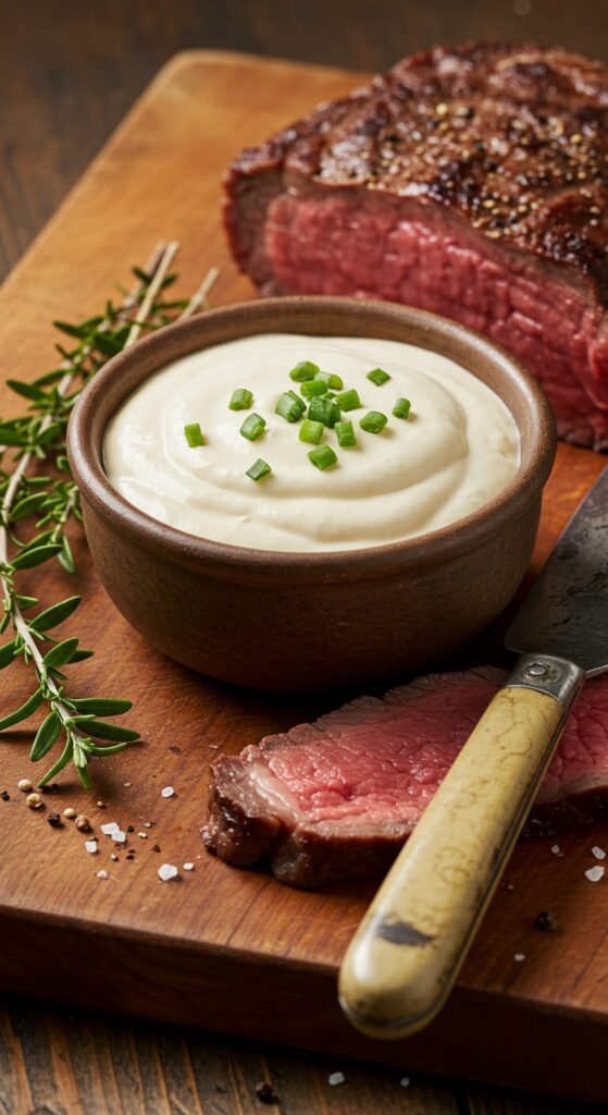 A smooth, steakhouse-style creamy horseradish sauce with balanced heat and tang, perfect for prime rib, steaks, or sandwiches.