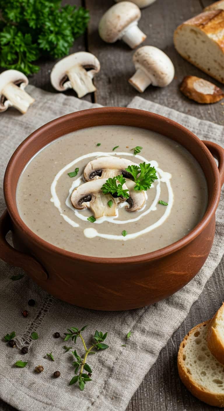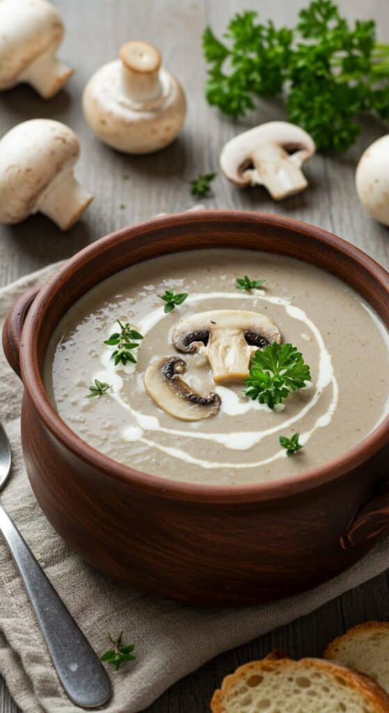 A rich, silky homemade creamy mushroom soup made with sautéed white button and cremini mushrooms, aromatic thyme, and a swirl of cream. Comforting, flavorful, and perfect for any season.