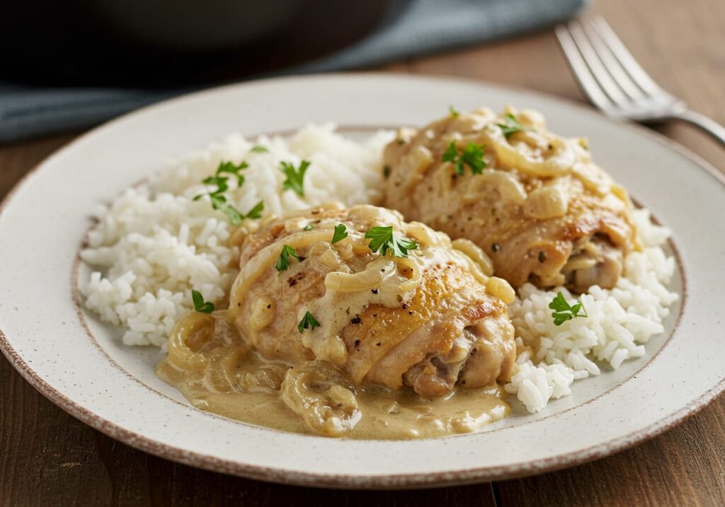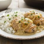 A comforting and creamy smothered chicken served over fluffy rice, perfect for a hearty meal.