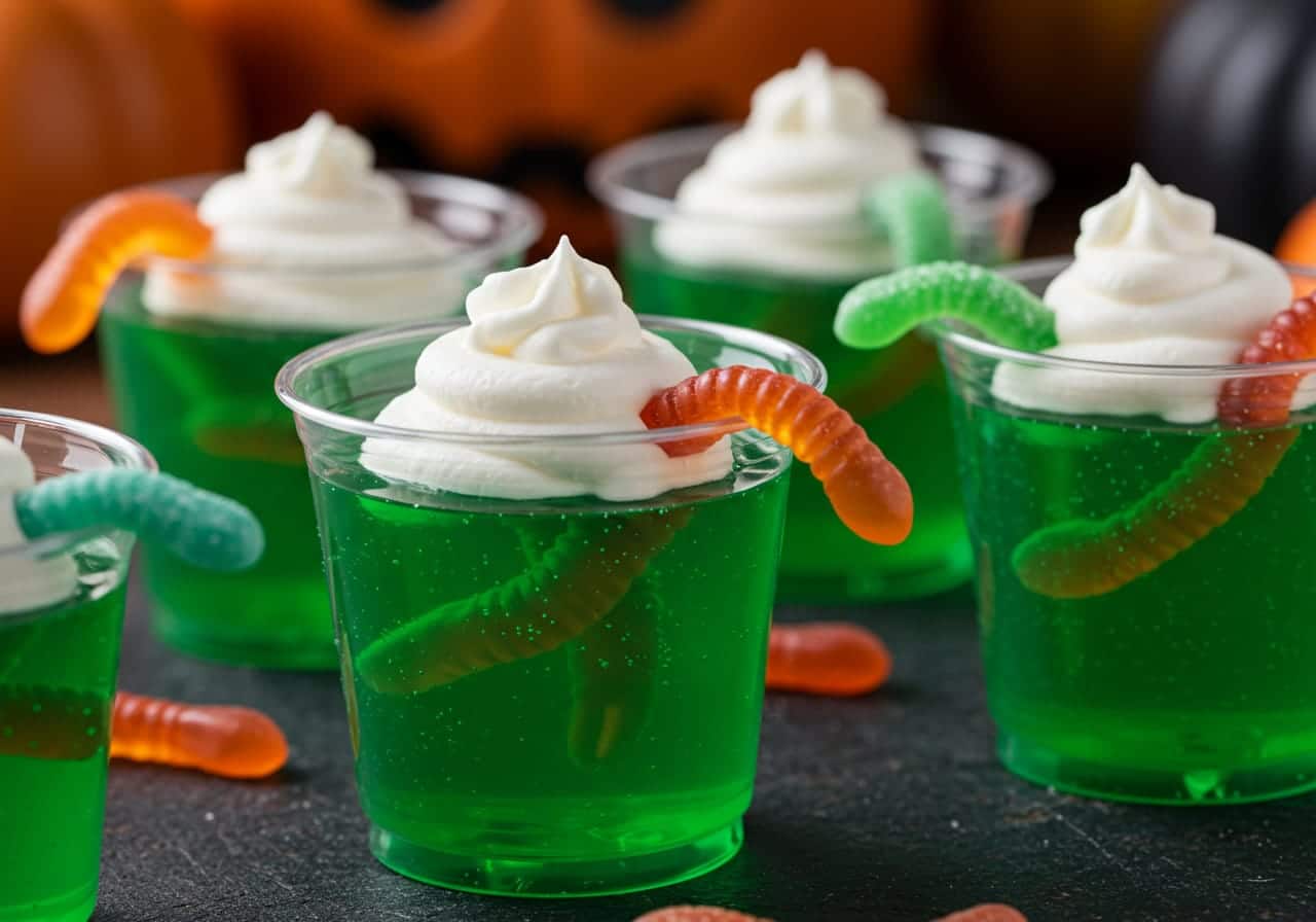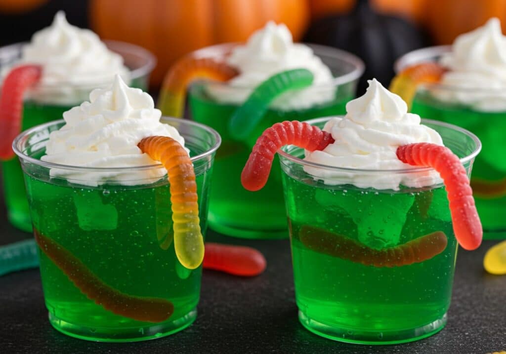 Dissolve the lime or watermelon Jell-O powder in 1 1/2 cups boiling water. Stir thoroughly until completely dissolved. Add 1 1/2 cups cold water to the mixture and stir. Pour the prepared gelatin evenly into clear plastic cups. Stick a few gummy worms into the gelatin, draping some over the edge for a “crawling out” look. Optionally place a gummy worm at the bottom of the cup for surprise. Chill in the refrigerator for about 4 hours or until fully set. Top each cup with whipped cream before serving. Place one gummy worm on top of the whipped cream for garnish. Serve chilled for best taste and texture.