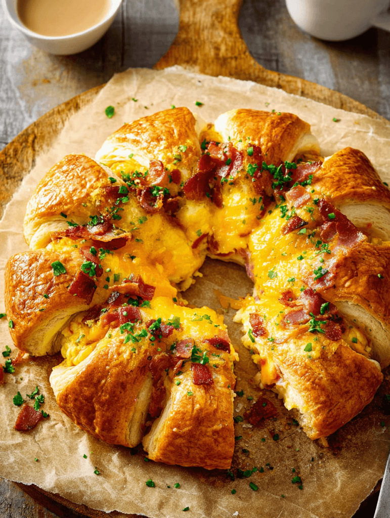 This recipe combines convenience with wow-factor presentation. Using refrigerated crescent rolls eliminates the time-consuming process of making homemade croissant dough, while still delivering those irresistible buttery, flaky layers everyone loves. The ring shape isn’t just beautiful it’s also practical, ensuring every slice gets an equal portion of bacon, eggs, and melted cheese.