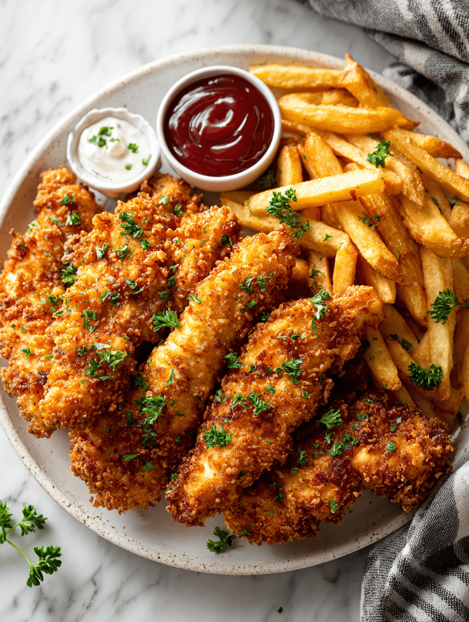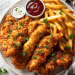 Golden, crispy chicken tenders paired with perfectly seasoned oven-baked homemade fries. This easy 30-minute dinner recipe is kid-friendly, budget-friendly, and better than takeout!
