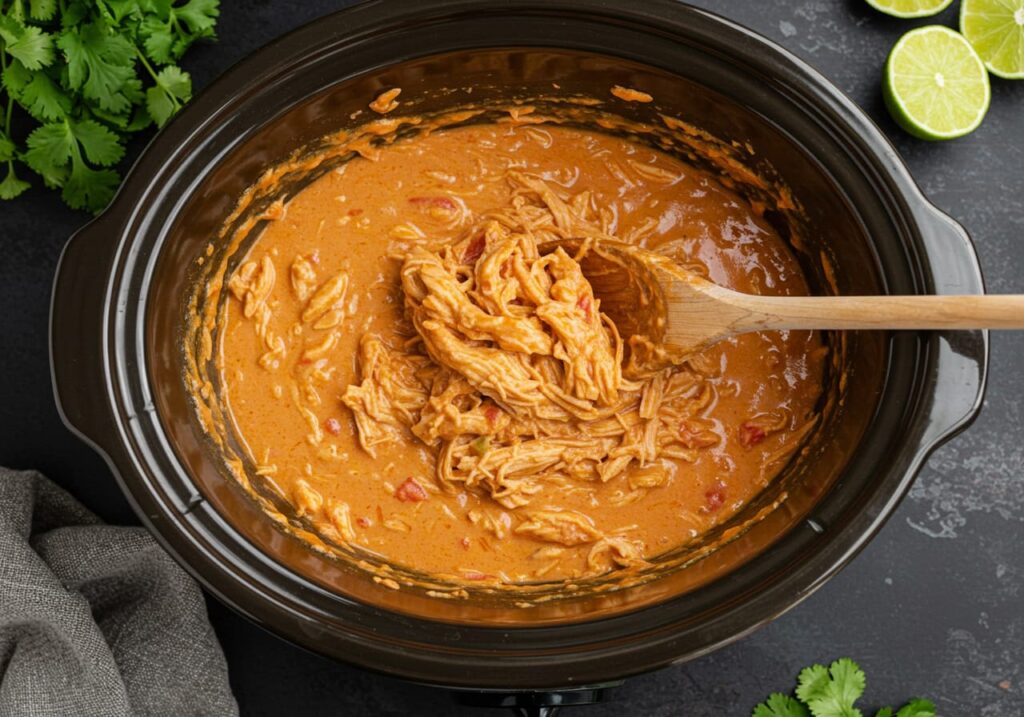 - Stir again to combine the shredded chicken fully with the salsa and creamy sauce.