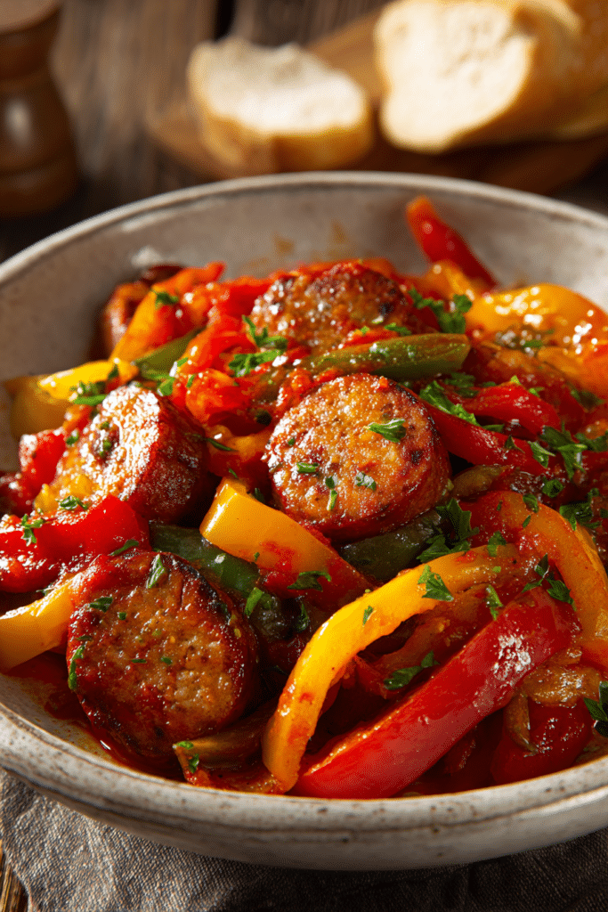 The magic of this recipe lies in the slow cooking process. As the sausages cook, they release their flavorful oils into the sauce. The peppers soften and caramelize slightly, developing natural sweetness that balances the savory sausage. The onions break down into silky strands that melt into the sauce. Every ingredient contributes to a harmonious, deeply satisfying final dish.