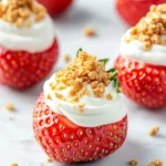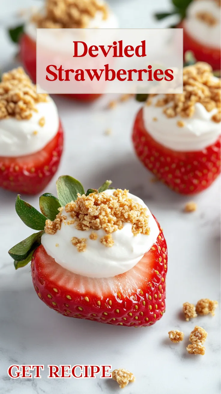 Deviled Strawberries are fresh strawberry halves hollowed out and filled with a fluffy, sweetened cream cheese mixture, then topped with crushed graham crackers. The presentation mimics classic deviled eggs, making them a fun and creative no-bake dessert perfect for spring party food and holiday gatherings.
