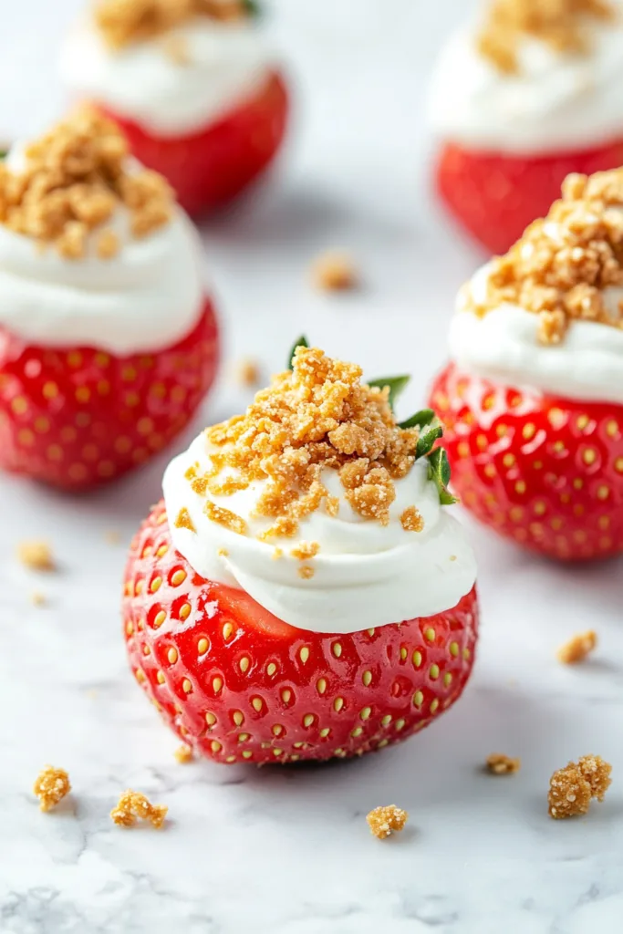 - Add the topping. Sprinkle crushed graham crackers generously over each filled strawberry for that signature cheesecake crunch.