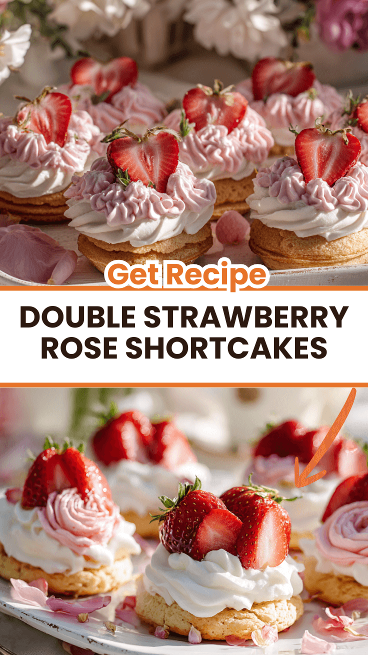 Elegant Double Strawberry and Rose Shortcakes feature tender lemon-buttermilk biscuits layered with rose-infused strawberry compote, pink whipped cream, fresh strawberry slices, and delicate candied rose petals. Perfect for special occasions and garden parties.