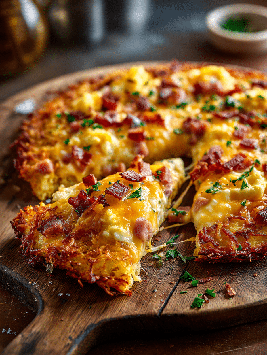 This easy breakfast pizza combines a crispy golden hash brown crust with scrambled eggs, crispy bacon, diced ham, and melted cheddar cheese for a satisfying savory breakfast that impresses every time. Perfect for family breakfasts or weekend brunches.