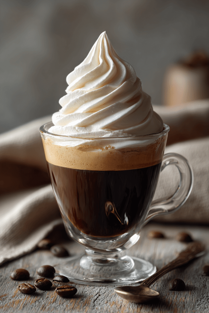 A rich Italian-style espresso con panna: hot espresso topped with cool, lightly sweetened whipped cream for a coffeehouse treat at home.