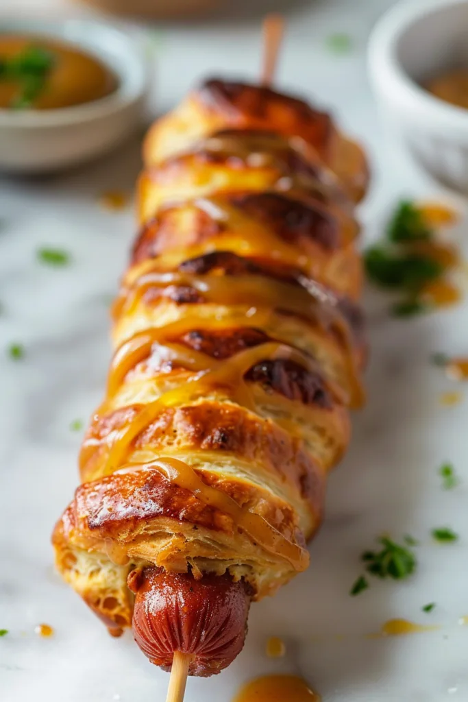 The quality of your hot dog matters in this recipe because the dough and glaze are the co-stars. Choose all-beef hot dogs for the best flavor and snap. Larger dinner franks work particularly well because they give you a more impressive presentation on the skewer. Avoid extra-long or extra-thin hot dogs, as they may not wrap as neatly with the dough strip.