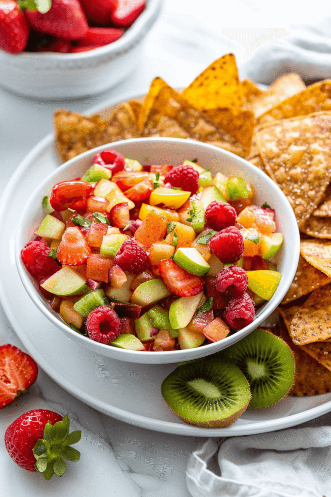 A fresh and colorful Fruit Salsa made with strawberries, apples, kiwi, and raspberries, served with crispy homemade cinnamon chips. Ready in 30 minutes and perfect for Mother’s Day brunch or any spring gathering.