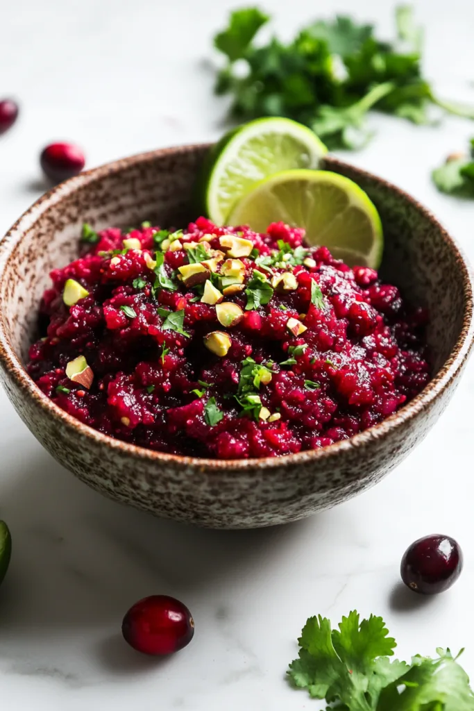 - Combine Everything: Add the chopped aromatic mixture to the cranberry bowl. Squeeze in the lime juice and add the lime zest. Stir well to combine. Season with 1/2 teaspoon of salt, then taste and adjust seasoning as needed.