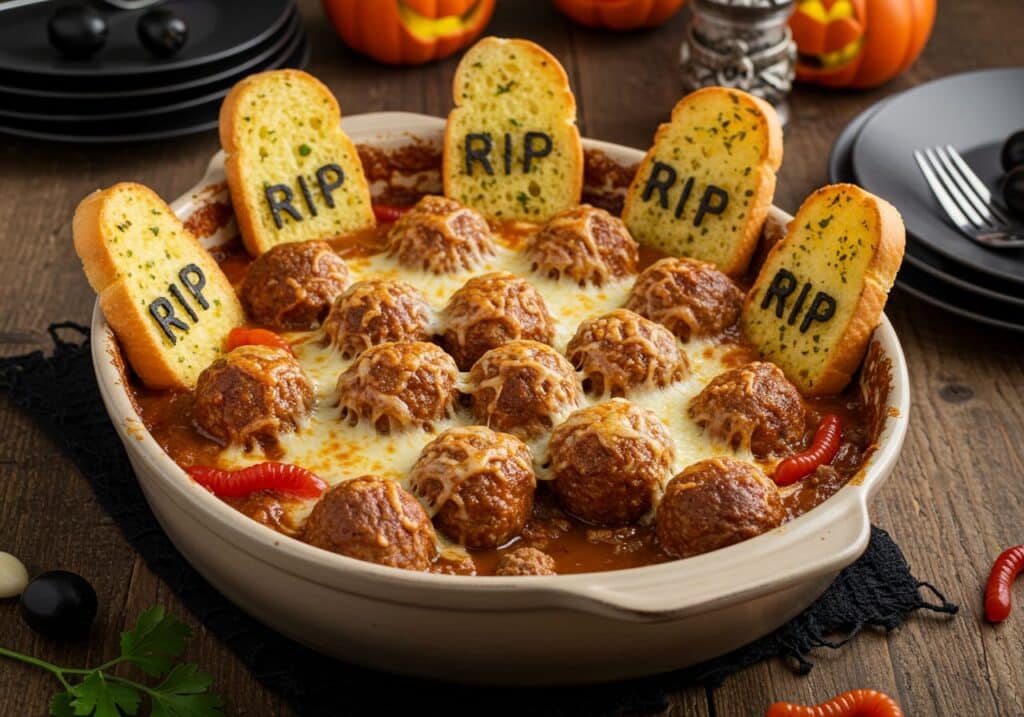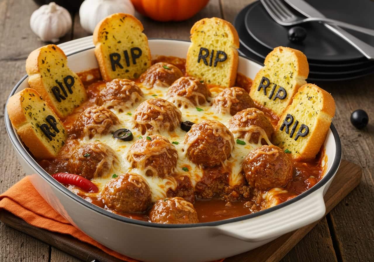 Graveyard Meatball Bak is a spooky, satisfying baked casserole featuring juicy beef and pork meatballs, creamy gravy, gooey cheese, and garlic toast ‘gravestones.’ Perfect for Halloween and comfort food lovers!