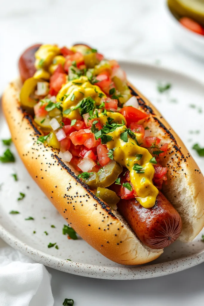 A true Chicago-style hot dog follows a very specific formula. It is built on a steamed or lightly toasted poppy seed bun and topped in a precise order with yellow mustard, sweet and spicy pickle relish, fresh white onion, tomato slices, a dill pickle spear, pepperoncini, and a final dash of celery salt. This combination is often described as “dragged through the garden,” and once you try it, you will understand why this is one of the most beloved Memorial Day dinner ideas in American food culture.
