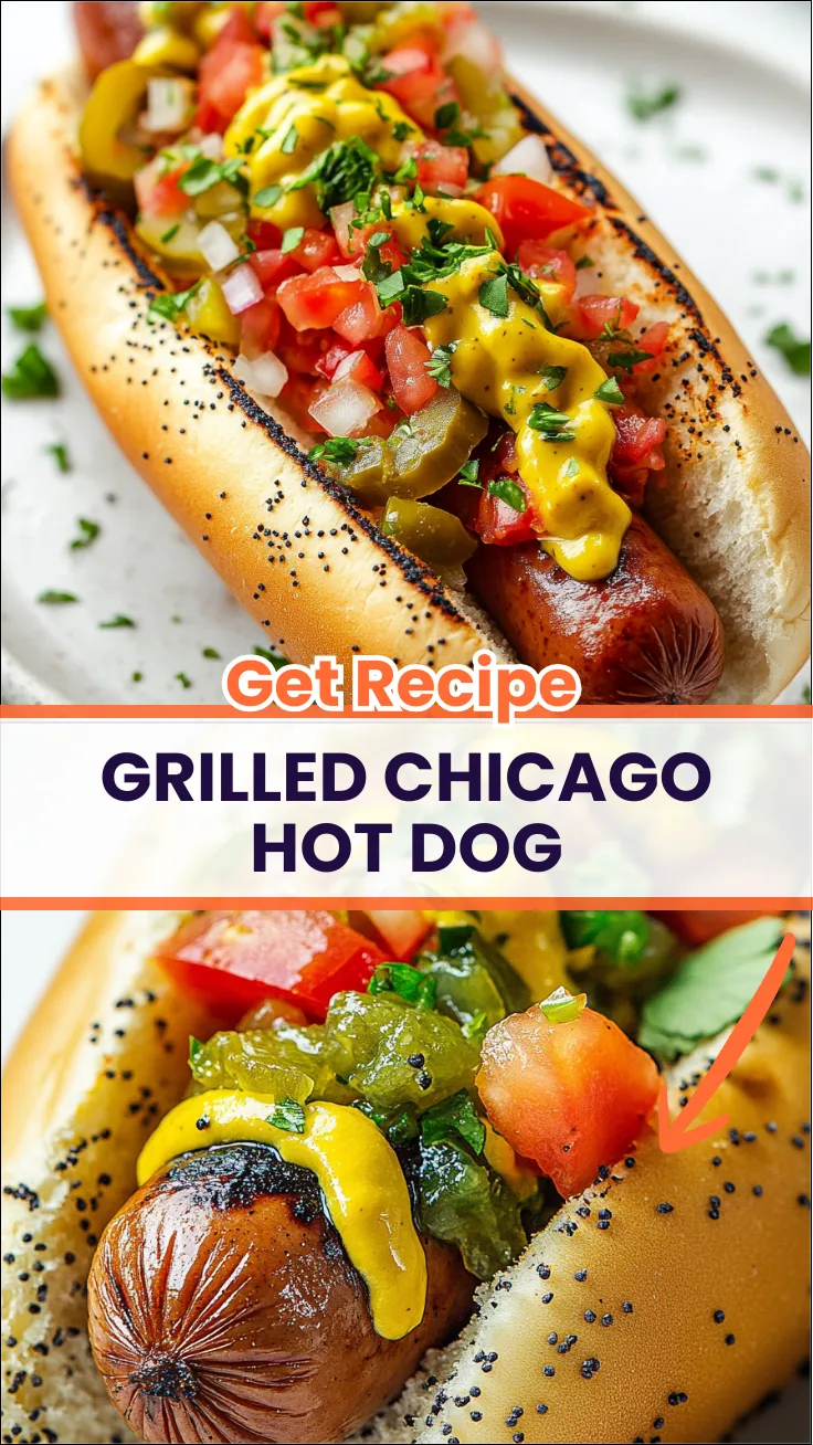 A Grilled Chicago Hot Dog is an American classic originating from Chicago, Illinois. It is a grilled all-beef hot dog served on a poppy seed bun and topped with yellow mustard, sweet and spicy pickle relish, chopped white onion, fresh tomato slices, a dill pickle spear, pepperoncini, and celery salt. The key rule is that ketchup is never used.