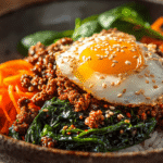 This Ground Beef Bibimbap is a quick and easy Korean-inspired rice bowl featuring savory seasoned ground beef, sautéed vegetables, a perfectly fried egg, and spicy gochujang sauce. Ready in just 30 minutes, it’s the perfect healthy weeknight dinner that’s both nutritious and packed with bold flavors.