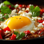 This Mediterranean-inspired Ground Beef Shakshuka combines seasoned beef, sweet peppers, and perfectly poached eggs in a rich tomato sauce. Ready in 30 minutes, it’s perfect for breakfast, lunch, or dinner!