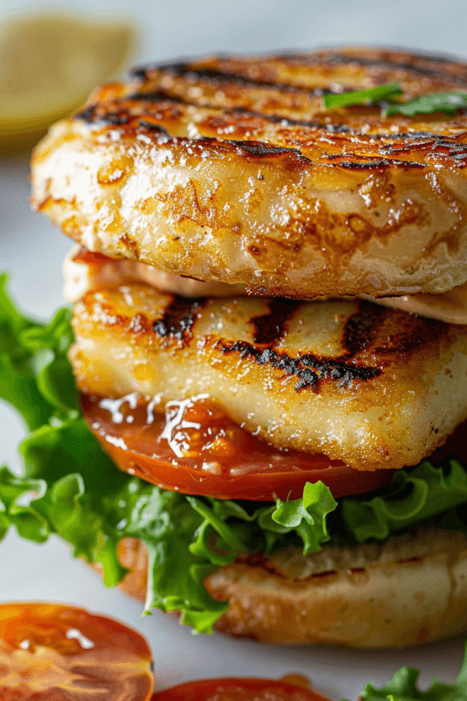 Crispy grilled halloumi cheese stacked on a soft brioche bun with creamy hummus, fresh tomato, butterhead lettuce, and zesty tomato salsa. The perfect vegetarian burger for Memorial Day cookouts, Fourth of July BBQs, and summer picnics.