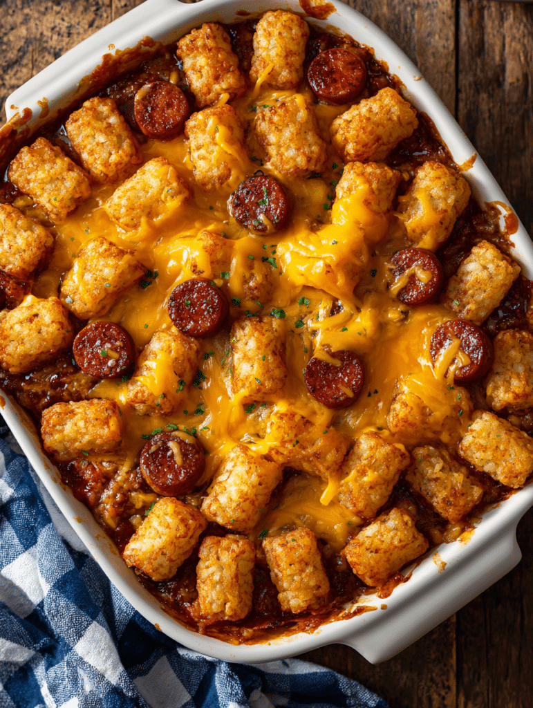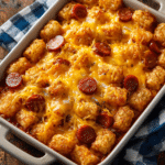 For best results, reheat individual portions in your air fryer at 350°F for 5-7 minutes to restore crispiness. Alternatively, microwave for 1-2 minutes until heated through, though the tater tots won’t be as crispy.